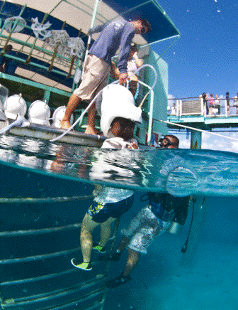 その後、鉄のはしごをたどって、深さ約8メートルの海底にゆっくりと下りていきます。