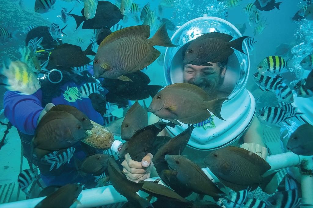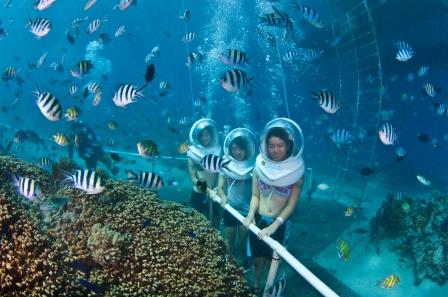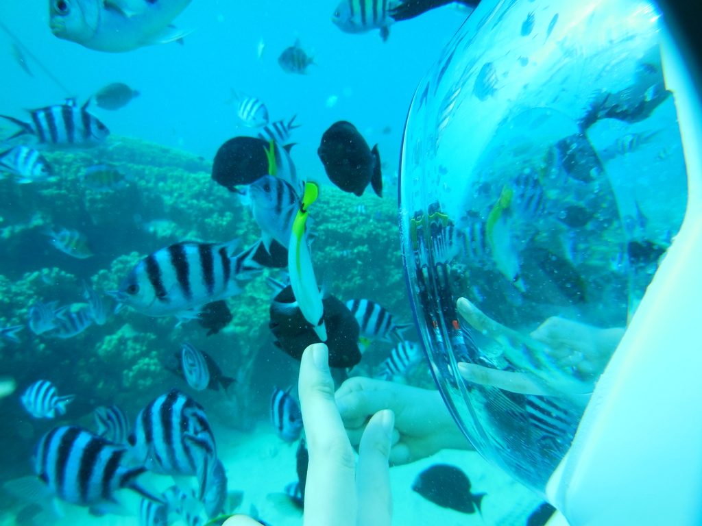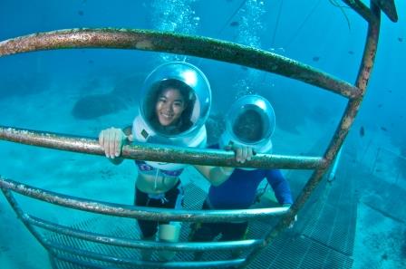 グアムの有名なアトラクションのひとつでフィッシュアイオーシャンパーク内にあるシーウォークは、宇宙飛行士としてガス管付きの特別なフードを着用し、美しい水中の世界を体験するアドベンチャーです。