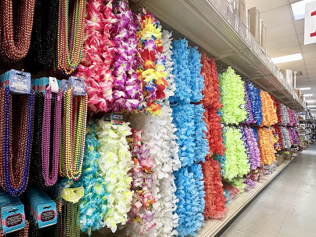 花環的種類多樣。這一款雖然是塑膠製的,但色彩鮮豔,靈感來自熱帶花卉。價格實惠,因此不只在畢業季,在其他節慶場合也很常見。