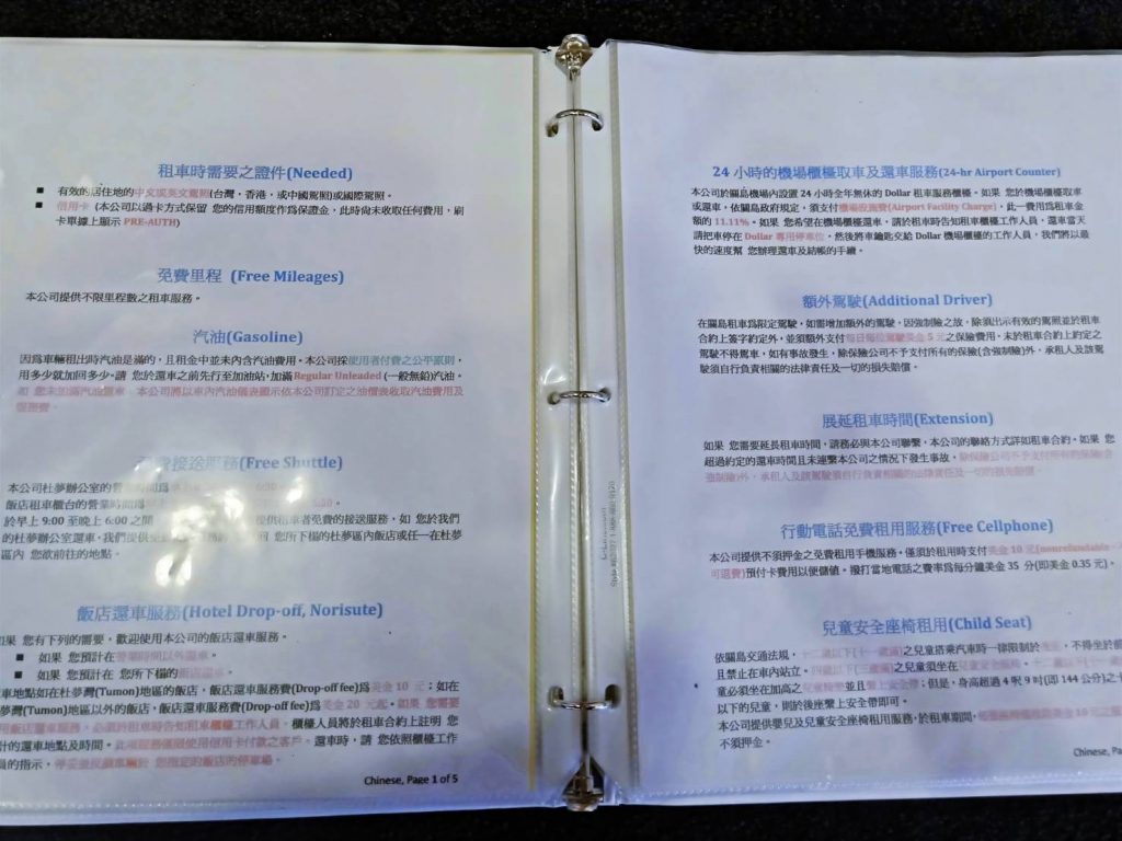 接著很快輪到我們,跟他說預約號碼後,請我們閱讀桌上這本中文白皮書,當中有全部的租車須知,詳讀後簽名很快就領著我們出去取車囉。
