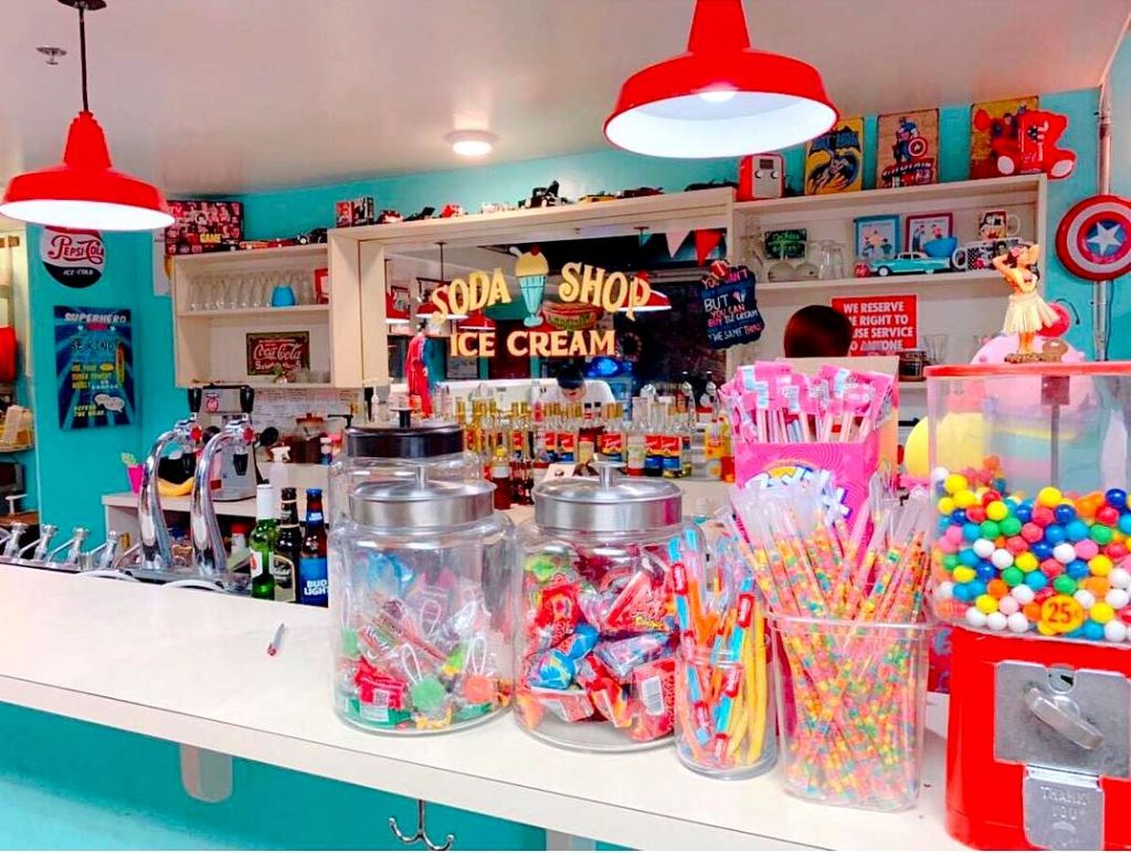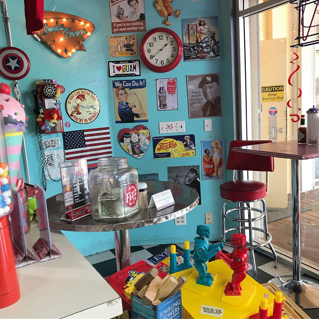 出入り口の隣の隅の小さな壁には、あらゆる種類のアメリカンスタイルの要素が散りばめられたこの場所は、とても人気があります。